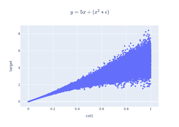 # display(Math(r"$y = 5x + (x^2 * \epsilon)$"+"\n"+r"$\epsilon \backsim \mathcal{N}(0,1)$"))